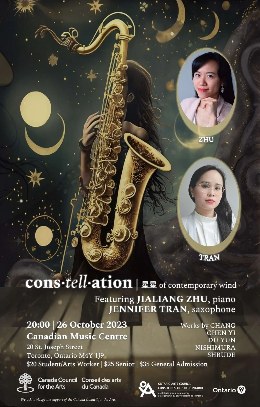 This concert is the result of a true partnership that began online during the isolation of the COVID-19 pandemic in 2021. Across two years, Jennifer Tran and Jialiang Zhu collaborated remotely—blending their artistic strengths and shared vision to celebrate contemporary works by women-identifying composers, and explore themes of identity, heritage, and connection. The concert’s title, cons•tell•ation | 星星 (stars) of contemporary wind, evokes the image of individual voices shining brightly and coming together like stars in a constellation.